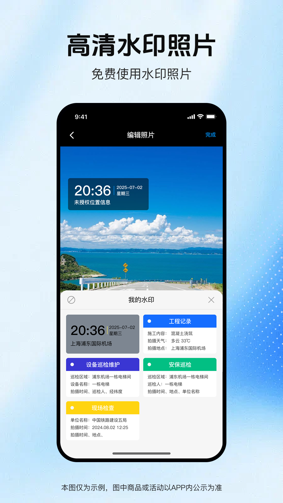 实拍水印相机,拍人像更出片!年轻人都在用的潮流个性相机App!超多拍照、拍视频、修图等功能,用影像帮助用户还原真实美! 【适用场景】 工作质量记录、考勤打卡、物业工作记录、建筑工程管理、外勤拍照、品牌宣传、现场取证、会议记录、执勤巡逻、旅行打卡等 【专业水印模板】 考勤打卡:真实时间地点无法篡改 * 工作记录拍照:物业管理、建筑工程管理、执勤记录、品牌宣传、会议记录等工作记录专属模板 * 实时更新:水印可自动更新为实时的日期、地点、天气等信息 自定义水印内容:编辑工作内容、设置自己的纪念日、修改地点名称、编辑心情文字等 【一键分享】 *QQ空间、朋友圈、微信好友、QQ好友、微博等各大社交平台,均可轻松一键分享,提升工作效率