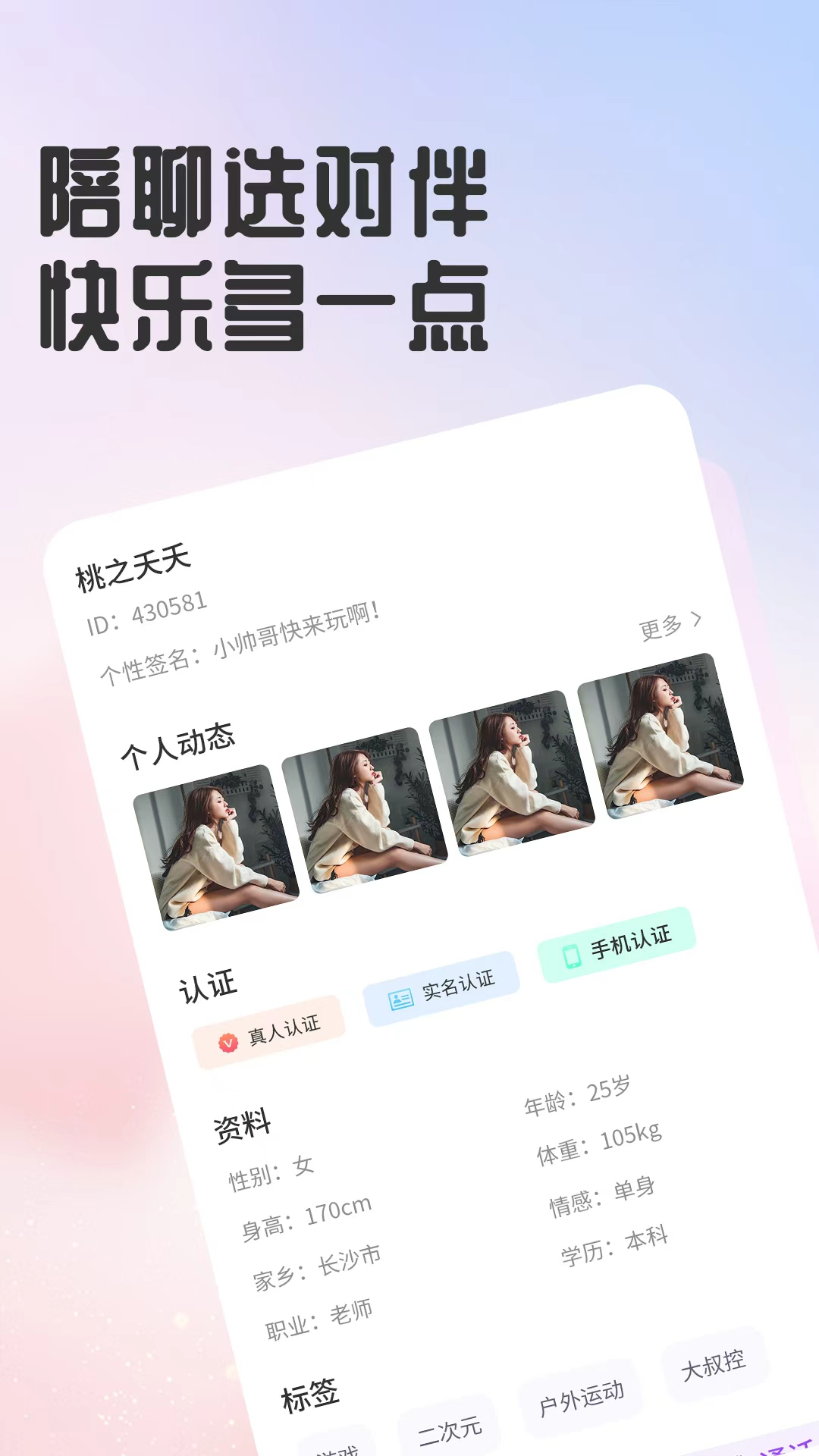 想找同频之人倾诉心事,却苦于无人共鸣?来「聊嗨」,走心陪伴新体验! 线上聊天、语音连麦、视频互动三重模式随心选,文字传递细腻情绪,声音治愈疲惫心灵,画面拉近彼此距离。无论是分享日常点滴,还是倾诉心底烦恼,都有懂你的人温柔倾听,不评判、不敷衍,让每一份情绪都能找到归宿。 没有复杂社交套路,无需刻意迎合,在轻松氛围里自在互动。在这里,每一次交流都饱含真诚,每一段陪伴都满含温度,帮你治愈孤独、释放压力。 遇见专属陪伴,开启一段双向奔赴的暖心情感之旅,让漫漫长夜有人陪伴,琐碎日常有人分享~