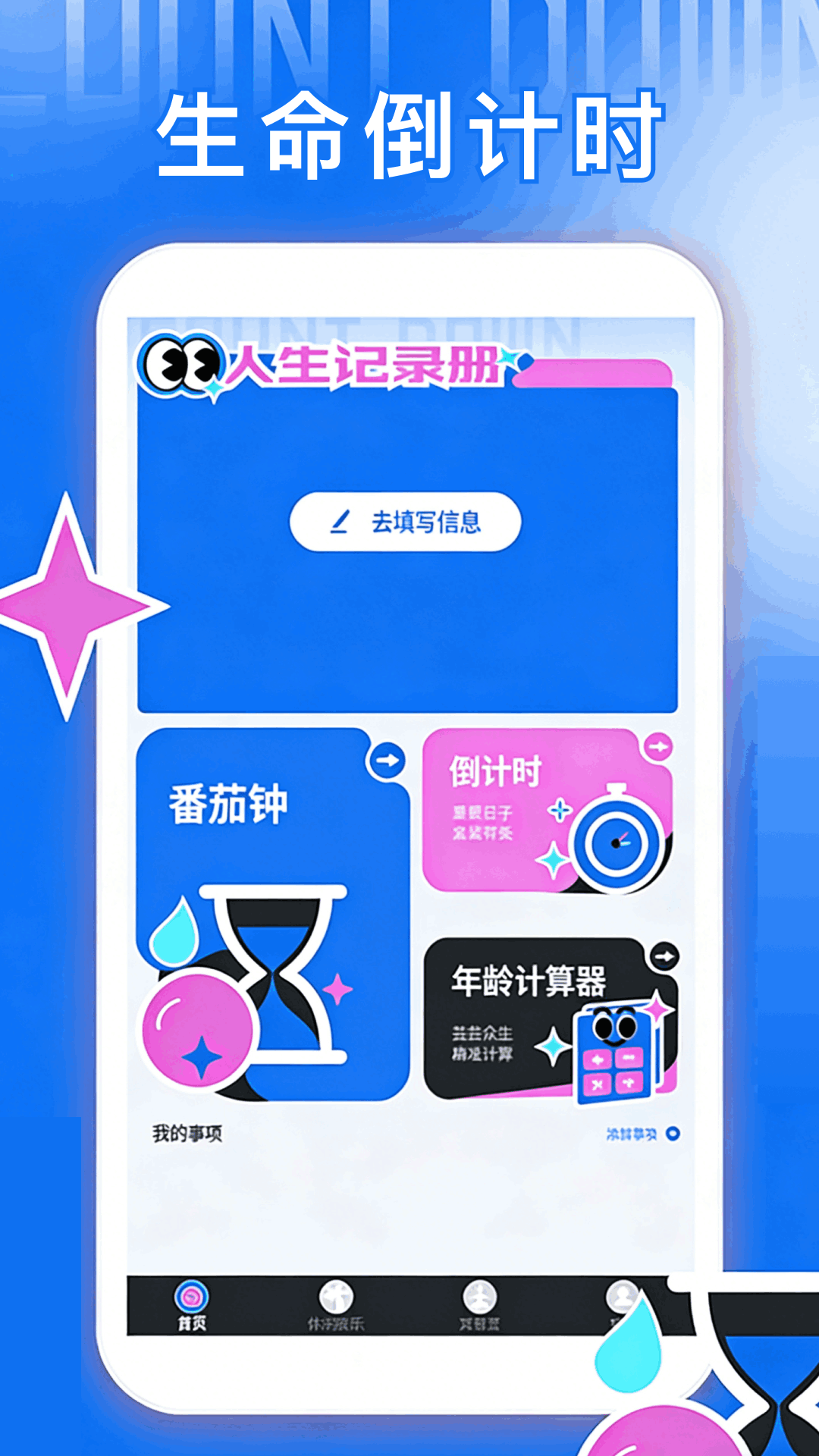 余生倒计时是一款可以为用户记录精彩人生和帮助用户享受人生的软件,添加出生日期以及预想预想寿命,就会显示用户出生天数,并开始余生倒计时。添加事项,帮用户记录人生精彩瞬间。