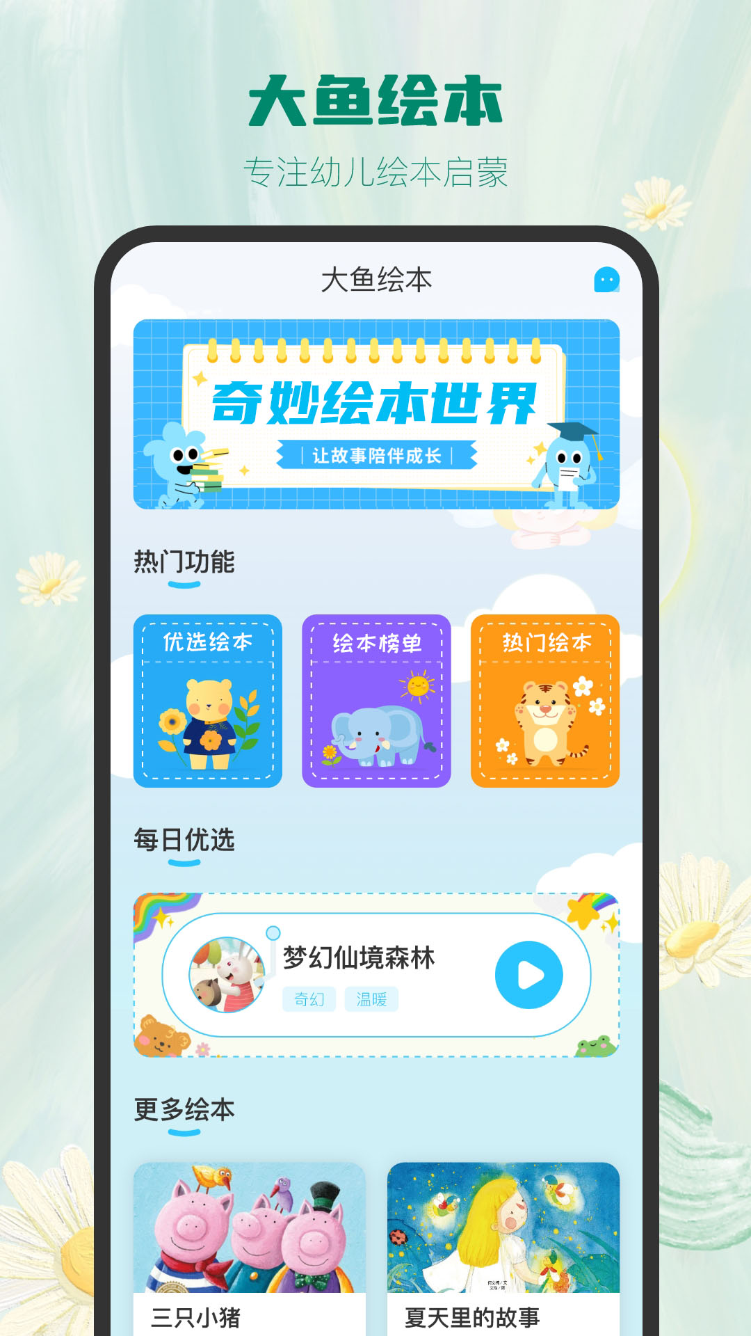 “大鱼绘本故事”APP是一款专为儿童设计的绘本阅读应用,它凭借独特的魅力和丰富的功能,赢得了广大家长和孩子们的喜爱。 以下是该APP的两大特点: 一、丰富多样的绘本资源,激发阅读兴趣 “大鱼绘本故事”APP汇聚了众多经典与原创的绘本故事,每一本都以其生动的图画、简洁的文字和丰富的色彩,为孩子们打造一个充满奇幻与想象的阅读天地。这些绘本内容多样,涵盖了童话、寓言、科普等多个领域,能够满足不同年龄段和兴趣偏好的孩子们。通过精心挑选的绘本内容,该APP旨在激发孩子们对阅读的好奇心,让他们在享受故事的同时,逐渐爱上阅读这一活动。 二、注重阅读理解能力与想象力的培养 除了丰富的绘本资源外,“大鱼绘本故事”APP还特别注重培养孩子们的阅读理解能力和想象力。绘本中的图画和文字相结合,为孩子们提供了一个自由发挥创意的空间。他们可以通过观察图画、理解文字,逐渐学会捕捉故事中的关键信息,理解故事的深层含义。同时,APP中的绘本故事往往蕴含着丰富的想象力和创造力,能够引导孩子们在阅读中发挥自己的想象力,创造属于自己的奇幻世界。 总之,“大鱼绘本故事”APP是一款充满爱与智慧的阅读应用,它凭借丰富多样的绘本资源和注重阅读理解能力与想象力的培养两大亮点,成为了孩子们成长道路上的良师益友。