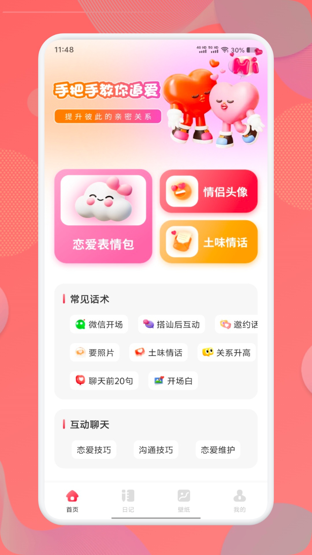 你是否会遇到过: 见到心仪男生紧张的不敢交流,不知道和TA聊什么? 网上记下的土味情话,却因场合不对一聊就翻车? 不知道该如何哄女朋友开心? 初次交谈不会聊天,甜蜜聊天话术库给你准备了30W+聊天话术,还有土味情话等话题,针对不同场景搜索话术,让聊天变得轻松愉悦!恋爱话术给你挽回恋情的情感指南,聊天相处都能更顺利。 还有海量精美壁纸供您选择。