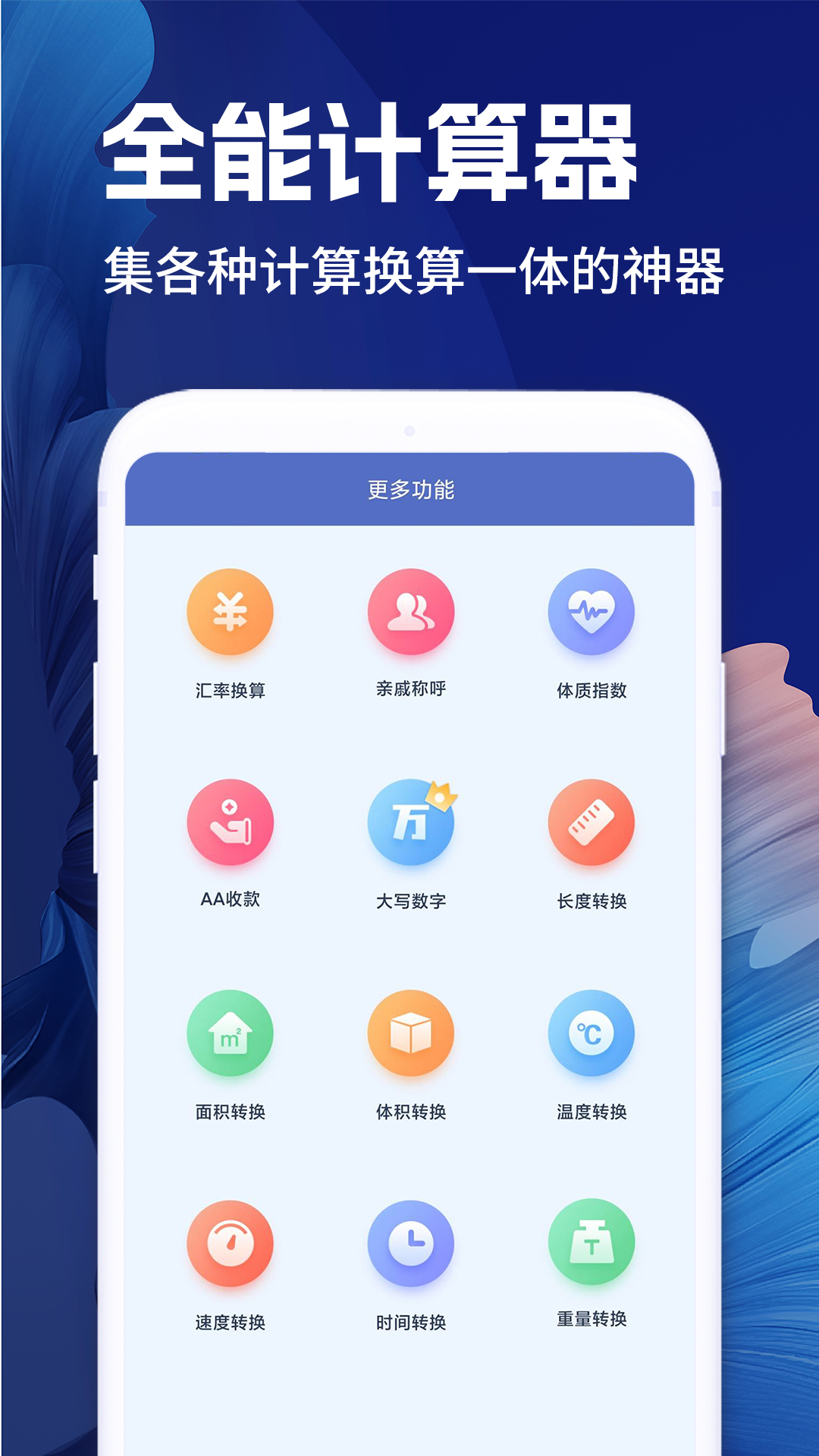 一款智能计算的计算器软件,集成了多项实用计算与管理功能,包体小,省流省内存,不仅能够处理复杂的科学计算,还能轻松应对日常生活中的分数运算和汇率换算,集成多种计算、换算于一体,支持、亲戚计算、房贷计算、五险一金、日期计算器、进制转换、理财计算、自定义公式、单位换算、年龄计算、BMI计算、购车计算、日常记账、备忘录等为一体,是一个全面、高效的生活助手! 【基础功能】科学计算器、轻松计算日期,大小写转换和进制转换,理财更简单! 【BMI计算】只能计算体脂,让减肥更轻松! 【记账备忘】一体两用,方便计算后快速记录,比自带的更好用! 【单位换算】支持长度、面积、体积、温度、速度、时间,让生活更方便!