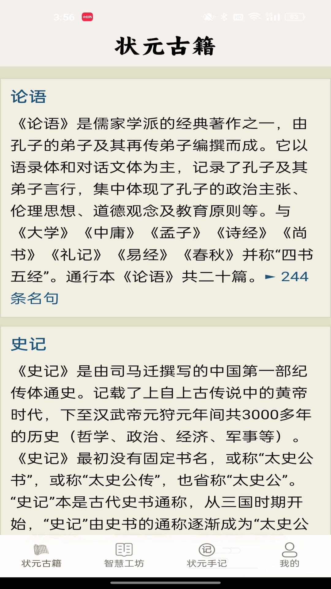 《智慧状元坊》——您的随身古典文学宝典!在这里,唐风宋韵触手可及,诗经古籍一网打尽。不仅轻松查阅背诵,更能记录您的独家诗书感悟,让每一次心灵触碰都成为成长的印记。探索千古名句的深邃意境,解锁背后的历史故事,让传统文化在指尖焕发新生。智慧碰撞,文采飞扬,与《智慧状元坊》同行,每一步都是诗和远方!