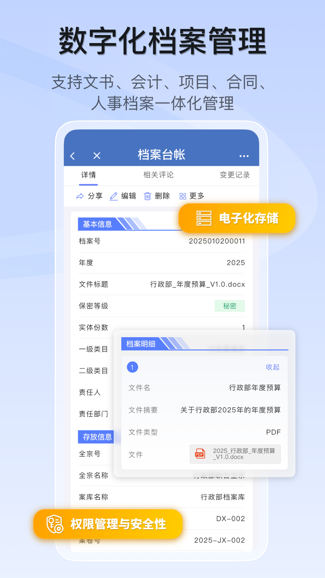 领先的数字化档案管理软件,覆盖电子会计档案、文书、人事、合同、项目等全门类电子档案和纸质档案,实现从档案的收集、整理、保存、利用、鉴定、销毁为一体的全生命周期管理。为企业搭建高效、合规、智能、共享的电子档案管理系统。